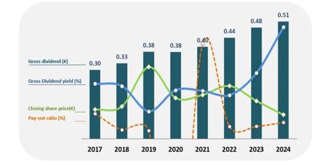 Subject to the approval by the Annual General Meeting of shareholders on 24 April 2025, the Board of Directors decided to recommend that the general assembly pay a dividend of 0.51 euro (gross) per share over 2024 (compared to 0.48 euro over 2023). This is 0.36 euro net, on a withholding tax of 30%. At 0.51 euro, the payout ratio is 75.30 % and the gross dividend yield is 4.9 %.