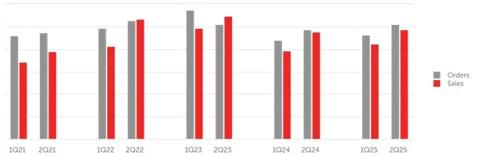 • Orders 1H25 of 487.5 million euro (+5% yoy), driven by recovery in EMEA (+27%)