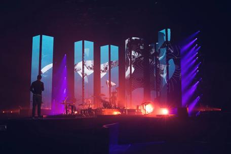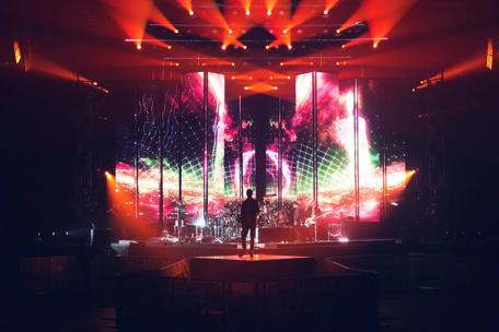 Moment Factory served as the design team and developed the groundbreaking content on massive multimedia platforms, specifically eight LED columns which acted as screens for constantly morphing and shapeshifting video projection, completely driven by the Barco XHD-400 Series media server.