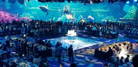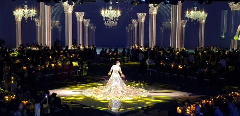 9 sets of Barco projectors were used to cover a gigantic, 118 m x 6 m screen with crystal-clear images creating an immersive effect, one-of-a-kind wedding experience. Barco projectors provide ultra-bright, stunning pictures in 4K UHD resolution and offer the widest color spectrum in the industry. The breathtaking display seen at the wedding was powered by three UDX-4K32 and six HDF-W26 projectors, unique combination between UDX Laser Phosphor and HDF Xenon lamp technology together. All the projectors are installed on the ceiling of the ballroom and fully calibrated perfectly using BARCO color spectrum to achieve constant color uniformity for specular wide screen images.