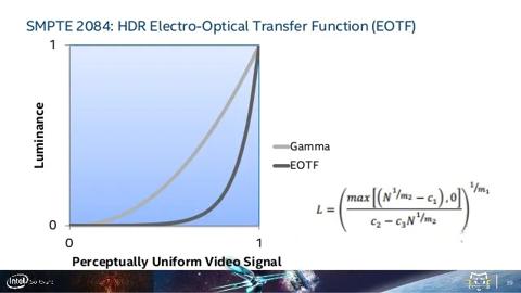 EOTF stands for ‘Electro Optical Transfer Function’; which basically means “how do you translate bits into nits?” or “how do you translate electrons into photons?”.The content is handed over to cinemas in the form of a DCP: the digital cinema package is a digital file – lots of bits – that needs to be loaded into the server, then sent to the projector and finally projected on screen – lots of nits. In order to guarantee the creative intent of the director, a standardized translation step is needed. Since the director isn’t present in the booth for every screening, he cannot preserve his creative intent live and on the fly (“I want to make the actor’s suit more reddish”). You have to trust in the way he stored his intent in the bit values of the DCP (“pixels that show actor’s suit = (4021, 212, 54)”). This is exactly what the EOTF does: it tells the projection system how to represent a certain input value.