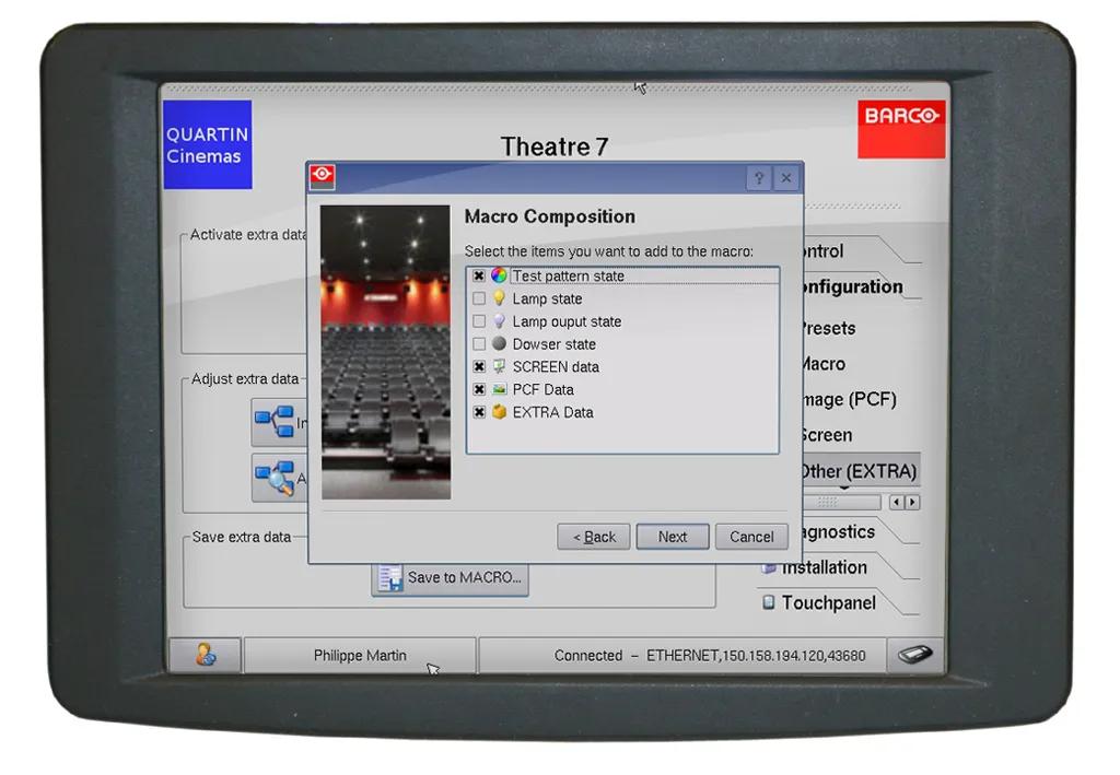 PC touch panel System interfaces LCD panel Active input selection Macros Automatic save to macro Creation of macros Projector preset activation Activate the stored projector preset configurations Projector preset configuration Full control and configuration of the projector presets Projector diagnostics Access to projector diagnostics and diagnostics log file