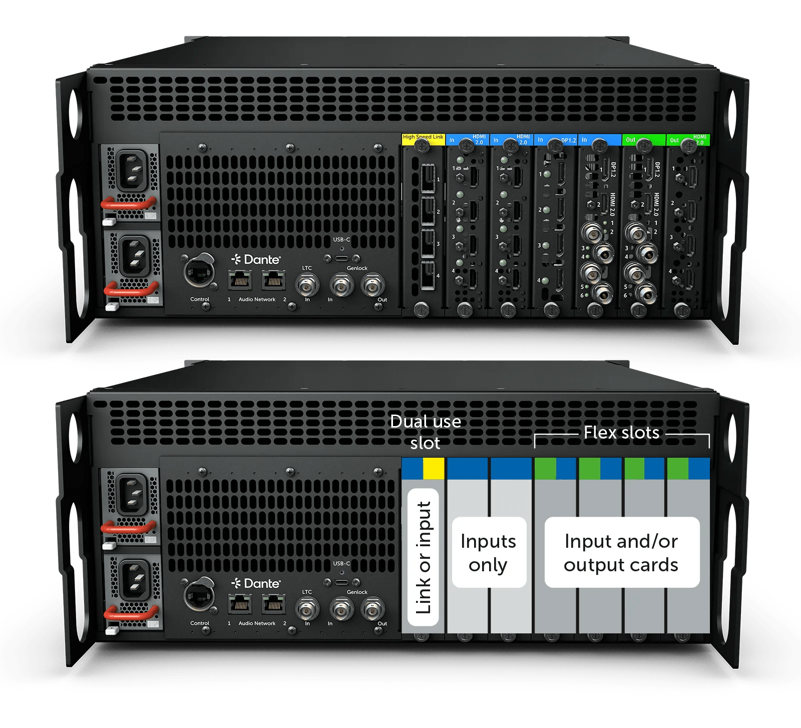 - Inputs Up to 7 input capable card slots, each input card supports up to 4x 4K@60p inputs
