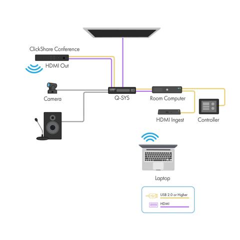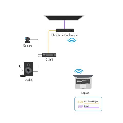 - Q-SYS and ClickShare Conference in a Microsoft Teams or Zoom Room: This configuration allows you to use your own device and switch to your preferred UC&C platform (BYOM). For example, this allows for a Zoom call in a room designed with a Teams room computer device. You can also wirelessly share content to the display and automatically connect to the AV in the room.