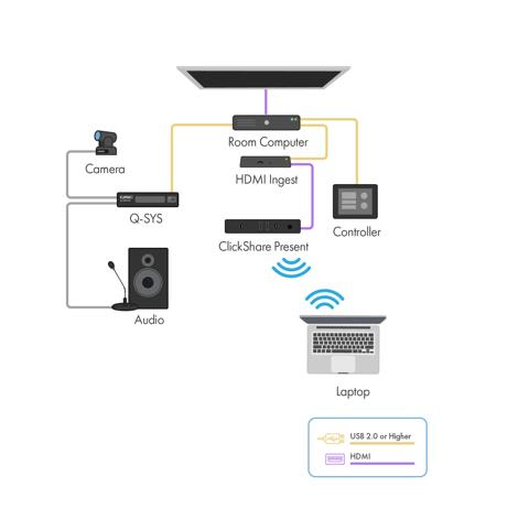 - Q-SYS and ClickShare Present in a Microsoft Teams or Zoom Room: This allows you to bring your own device (BYOD) and wirelessly share content to the room display in a Teams Room or Zoom Room environment, without having to force all attendees to run the VC application on their own device.