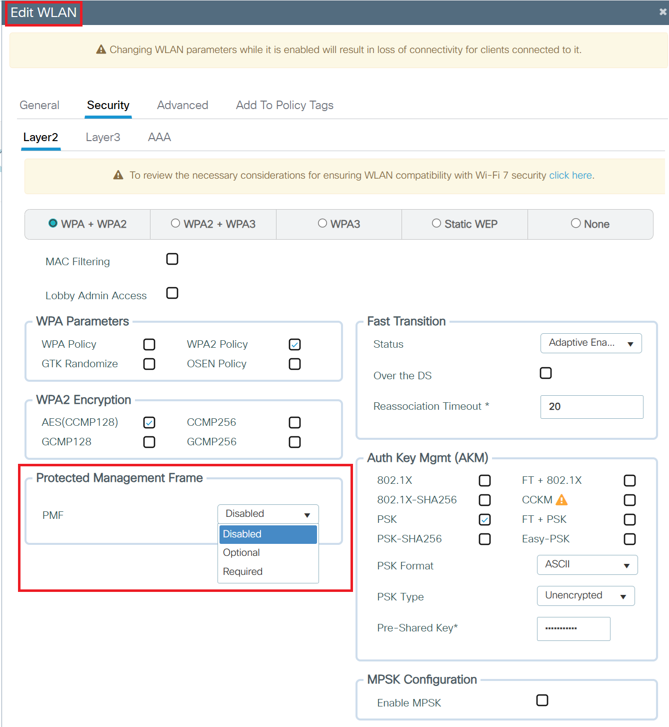 - Go to the Protected Management Frames (PMF) option and configure it to either Optional or Disabled