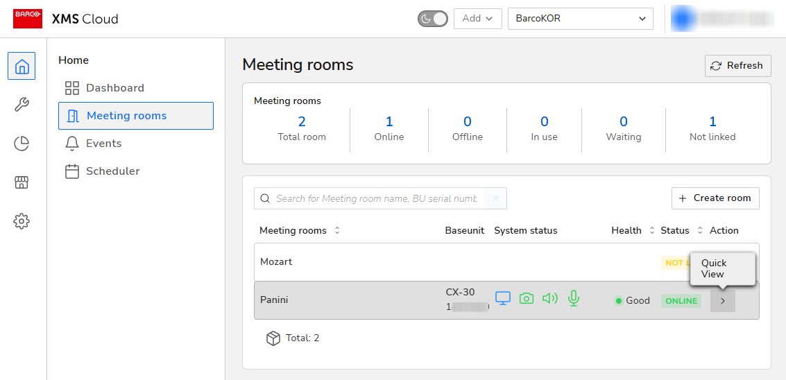 Log in to XMS Cloud and go to the Home > Meeting rooms to display the list of available rooms.