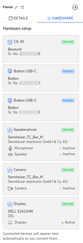 All connected peripherals (e.g., USB device - speakerphone, camera, display)