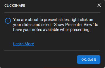 Start the PowerPoint slideshow and immediately, a notification message about how to share PowerPoint in the presenter view will appear in the application. Click OK, Got it to close notification message.