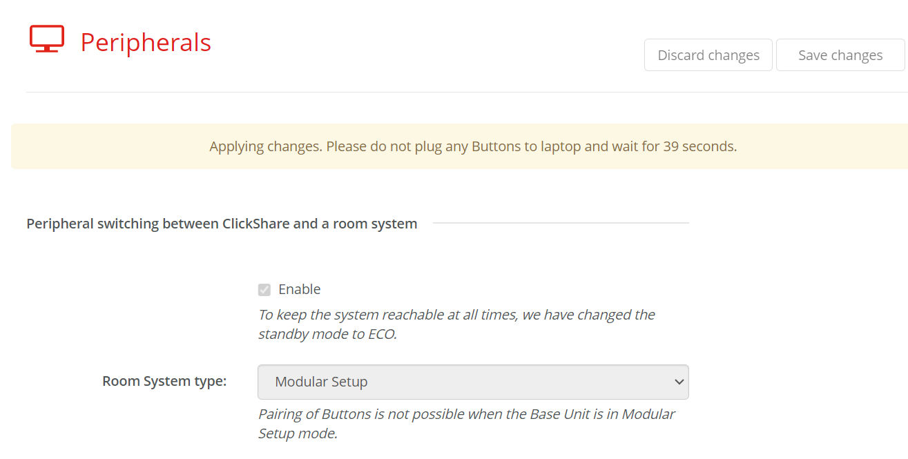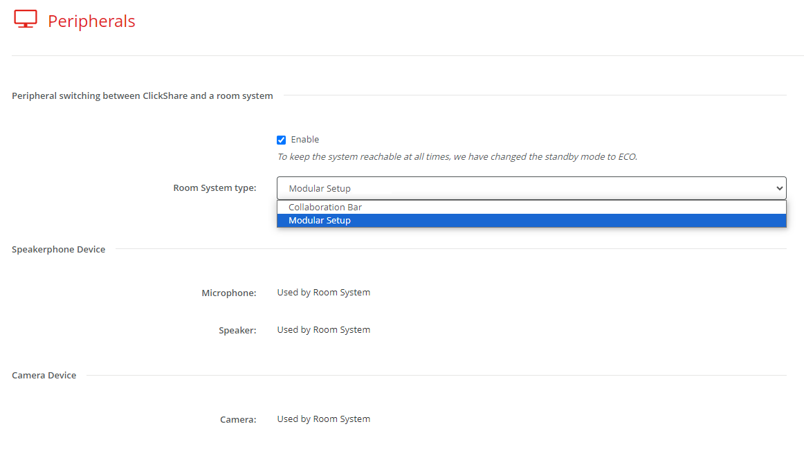 When Modular Setup is enabled, only the ECO mode (in the ClickShare Configurator) can be used. If attempted to enable the Standby mode, it will automatically switch to the ECO mode.