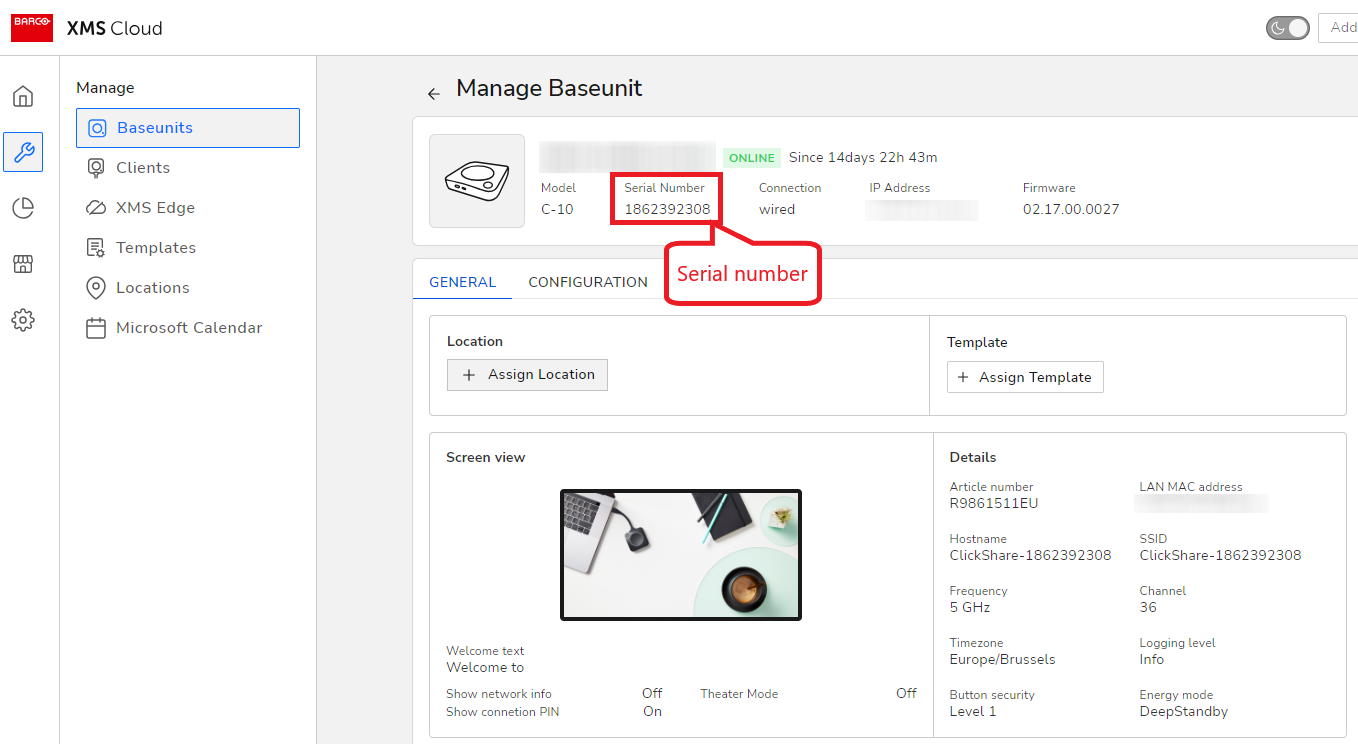 - Location: The Manage Baseunits page in the XMS Cloud contains information about the product's serial number.