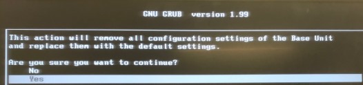 - The following message is displayed: This action will remove all settings of the Base Unit and replace them with the default settings. Are you sure you want to continue?