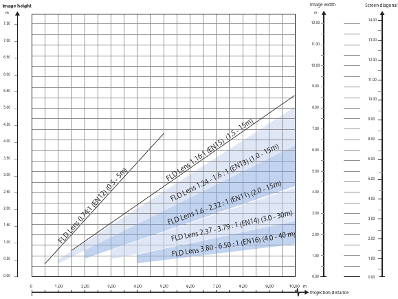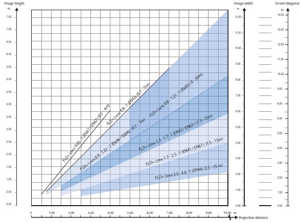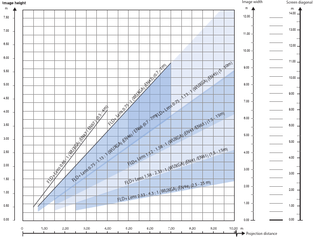The following graphs illustrate the image size (W) and projection distance (D) for each of the projector lenses.