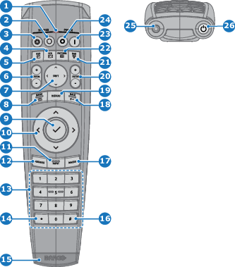 功能图像 5–1 1按钮指示灯2快门打开3快门关闭4LCD/触摸屏开/关5投影机 OSD 开/关6镜头变焦7镜头平移8菜单打开/关闭9菜单选择,确定按钮10菜单导航11输入选择12地址按钮13数字按钮14退格(输入值时)15XLR 连接器16小数点(输入值时)17宏按钮(未使用)18菜单背景19默认值按钮20镜头聚焦21RGB 滤波器22测试图案23开机24关机253.5 mm 插孔26RCU 开/关