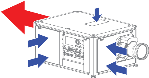 投影机的顶部、前部和右侧分别设有一个进气口。每个进气口均配有一个滤尘器。有关清洁/更换说明,请参阅章节 “投影机维护”。