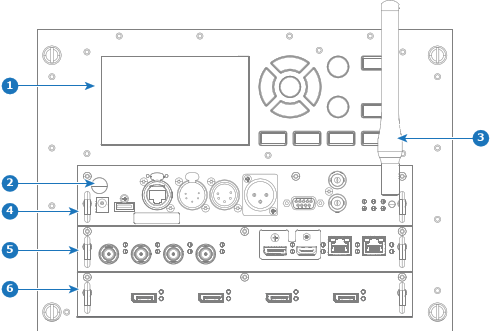 输入和通信模块由本地键盘、LCD 面板 (1)、通信面板 (4) 和四路组合输入板 (5) 组成。自由输入插槽可供可选模块使用(例如四路 DP 1.2 输入电路板)。