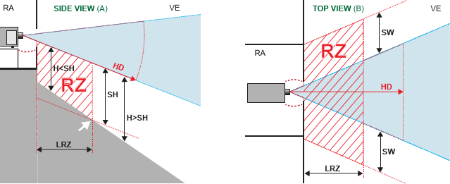 根据国家要求,从投影镜头到相关危害距离 (HD) 之间的区域内,任何人员均不得接触投射光束。通过建立足够的隔离高度或设置障碍,就不会出现上述情况。最小隔离高度考虑允许除操作员、演出者或员工以外的人员站立的表面。