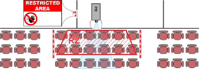 例如,当电投影机的 HD 大于 1 米并且将光投射到一个可能有人的不受控区域时,应根据“固定投影机安装”参数进行定位,以使 HD 不会延伸到观众区域,除非光束至少高出地板 2.0 米。在合理地预期到无节制行为的环境中,在 HD 以内,最小隔离高度应大于或等于 3.0 米,以防止可能的暴露,例如一名观看者坐在另一名观看者的肩膀上。可通过在天花板上安装图像投影机或通过使用物理屏障获得足够大的隔离高度。