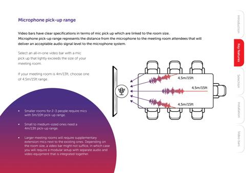 Key features. Explore the key capabilities of all-in-one video bars: microphones and speakers, pick-up range, camera resolution, field of view, and much more.