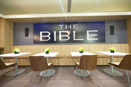“We really wanted to create a cool, hip urban space that was all about the Bible yet geared toward the City’s youth, so we knew we had to make it technology driven,” comments Matt Steinruck, Director of Arts & Media Bible Advocacy for American Bible Society. “When we began the design process, our goal was to create a warm, welcoming space that presented the Bible in a subtle way. Of course, it had to be technology-driven to meet the media-savvy needs of young as well as mature audiences.