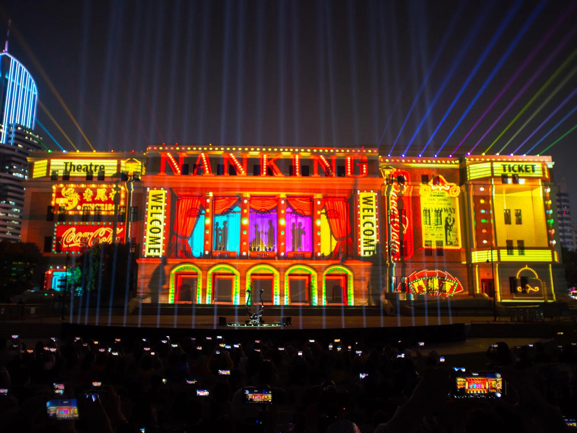 The eight-minute show consists of five chapters: Prologue, Echo, Variations, Renascence, and Cadenza. Chinese traditional music, architecture, and light are innovatively blended into a historical scroll painting. Visitors see visuals of Mei Lanfang, the great master of Peking Opera, performing the classics of Chinese opera, Zhao Dan and Zhou Xuan in their iconic movie, Street Angel, witnessing the enlightenment of the Chinese film industry, and dazzling images of violins and musical notes representing the bridge that connects eastern and western music. Under the shinning blue dome and raising curtain unfolds the story of how the Concert Hall was relocated and renovated…
