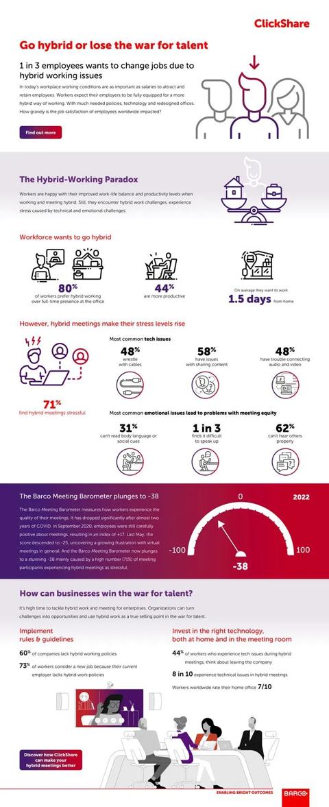 1 in 3 employees wants to change jobs due to hybrid working issues. In today's workplace working conditions are as important as salaries to attract and retain employees. Workers expect their employers to be fully equipped for a more hybrid way of working. With much-needed policies, technology and redesigned offices.