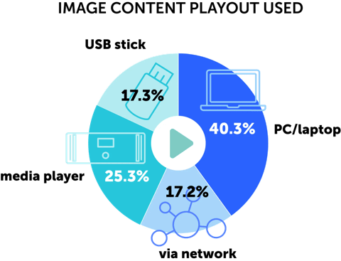 As a result, 55% of the interviewed professionals indicate that they produce their content in-house or use Open-source content. Additionally, 57.5% of the professionals opt for PCs, laptops, or USB devices for image content playback, rather than relying on professional media servers. These choices reflect a preference for more accessible and affordable solutions.