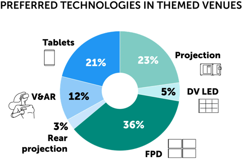 Flat panel displays (36.2%) and projectors (23.2%) together make up over half of all visualization technology across our respondents. Tablets and virtual/augmented reality sets are the next choice, followed by direct view LED and rear-projection installations.