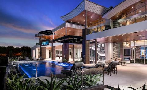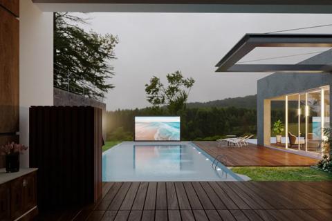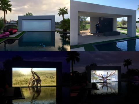 Outdoor pool solution, customer wanted to have a big outdoor screen for the family to enjoy movies in the afternnon/ evening when the sun was setting. Projector and screen are installed in motorized confided space when they are not in use. Technology is only visible when in use. Projector used is a Loki.