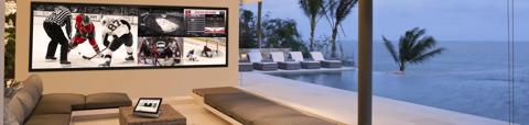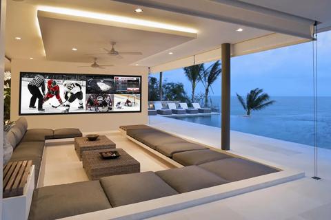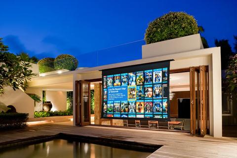 Outdoor rear projection solution. Customer is a big sportsfan and likes to watch several games at the same time and follow statistics, all possible on this huge 5 meter wide screen with Barco image processing for watching multiple sources at the same time.
