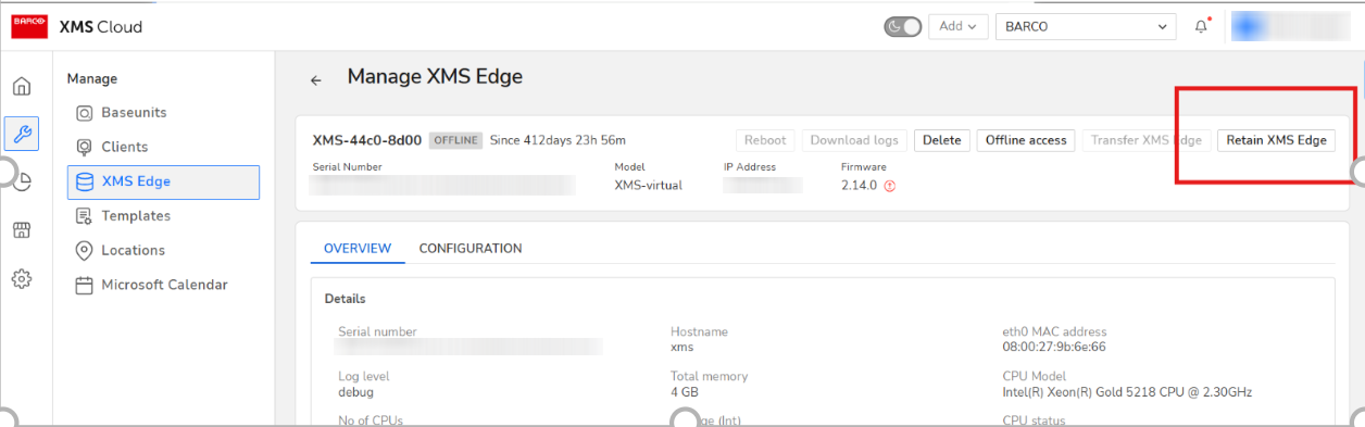 After the update the XMS Edge shows as active but shows offline in XMS Cloud and remains unreachable from its Web interface.